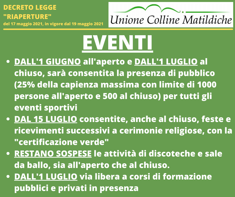 - dal 15 giugno saranno possibili, anche al chiuso, le feste e i ricevimenti successivi a cerimonie civili o religiose, tramite uso della “certificazione verde”. Restano sospese le attività in sale da ballo, discoteche e simili, all’aperto o al chiuso;