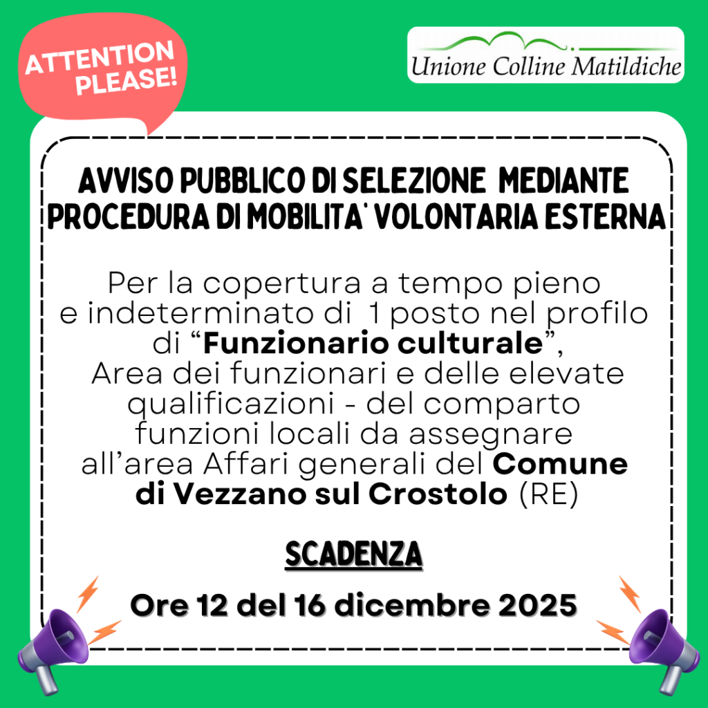 Avviso pubblico di selezione mediante procedura di mobilità volontaria esterna per un posto nel profilo professionale di “Funzionario culturale nel Comune di Vezzano sul Crostolo