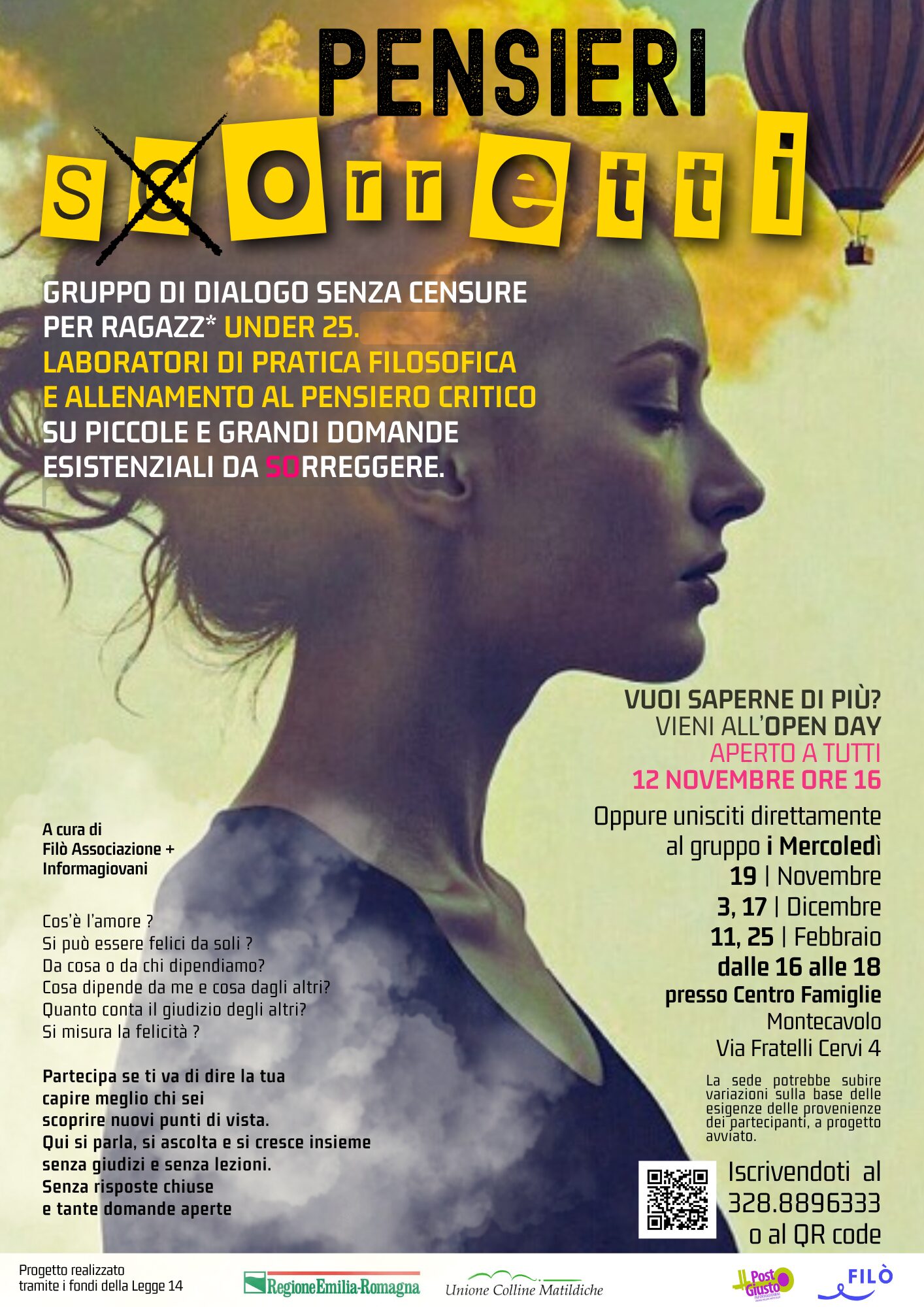 Pensieri S©orretti (aperto a ragazzi e ragazze dai 15 ai 25 anni) partirà con una prima giornata di open day per venire a conoscere il Filò attraverso laboratori creativi il 12 novembre alle ore 16, presso il Centro Famiglie di Montecavolo (Via Fratelli Cervi 4).