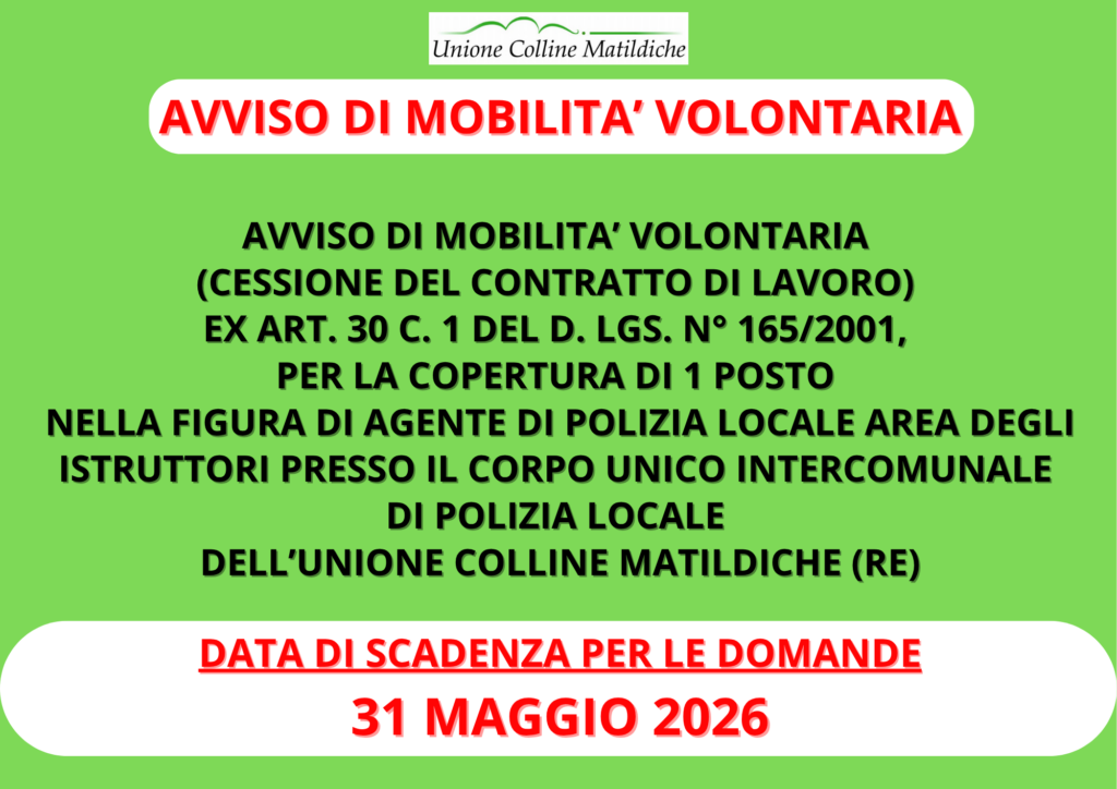 Avviso di mobilità volontaria art. 30 c. 1 del d. lgs. n° 165/2001, per la copertura di 1 posto nella figura professionale di agente di Polizia Locale Area degli istruttori presso il Corpo Unico intercomunale di Polizia locale dell’Unione Colline Matildiche.