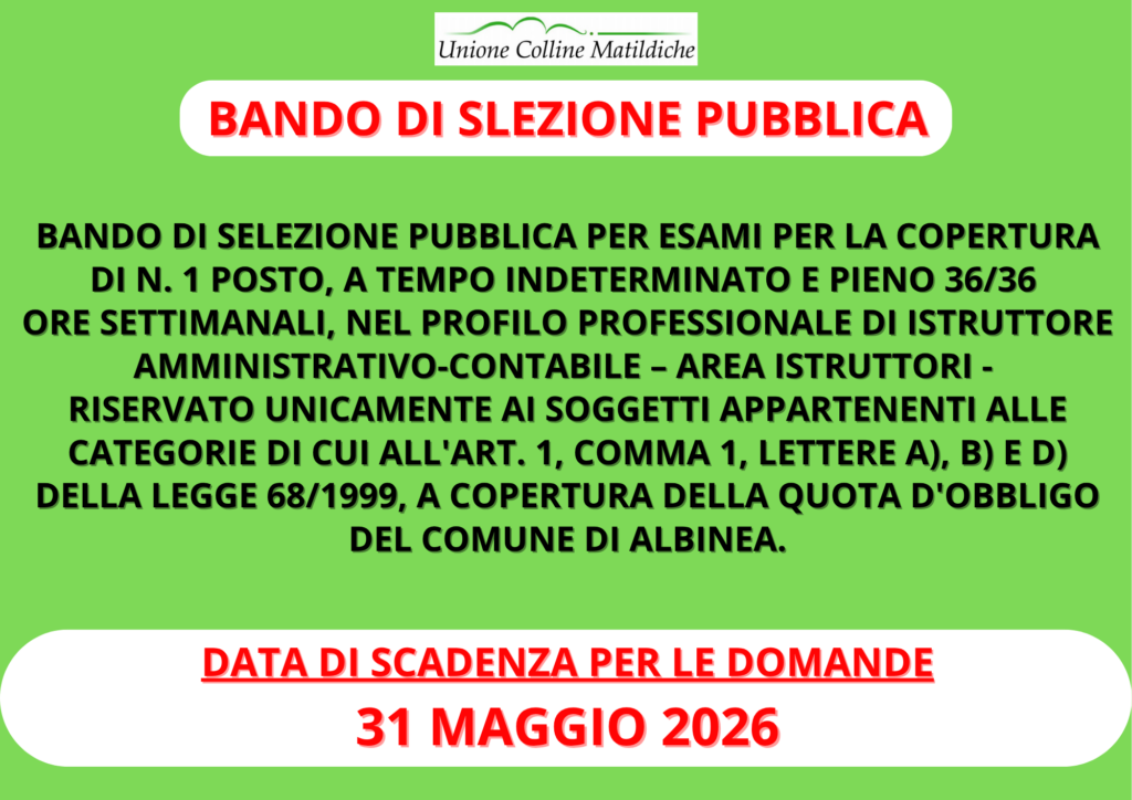 Bando di selezione pubblica per esami per la copertura di n1 posto, a tempo indeterminato e pieno 36/36 ore settimanali, nel profilo professionale di Istruttore amministrativo-contabile – Area istruttori – riservato unicamente ai soggetti appartenenti alle categorie di cui all’Art. 1, comma 1, lettere a), b) e d) della legge 68/1999, a copertura della quota d’obbligo del Comune di Albinea.